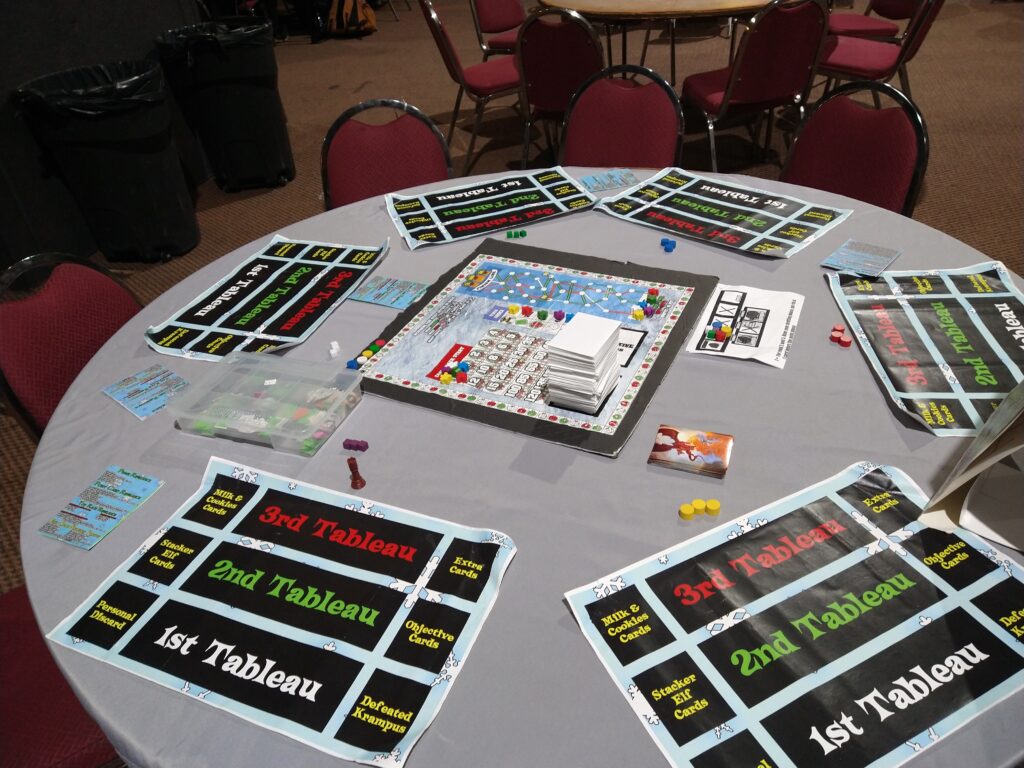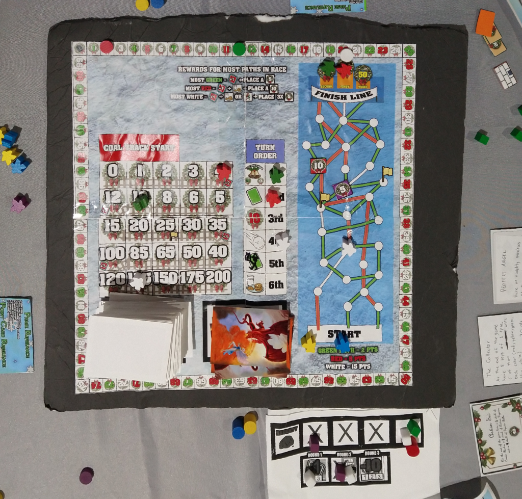 Players will have a Tableau (board area), which they will lay down point cards they acquire when drafting. After point cards are laid down, the turn order is decided, and then event cards will be played. After all events are played, point scoring of a player’s tableau occurs. In the following phase comes the Elf Charity Toy Race, which also determines if a player is Naughty Of Nice. Players will donate toys to rush their elves up the track towards the goal for big points, and show how nice they are by doing so, which those who are Naughty get penalties. Lastly, comes the final phase which is the Coal Track, where players get rid of coal for large points. After round 3, end game scoring occurs.